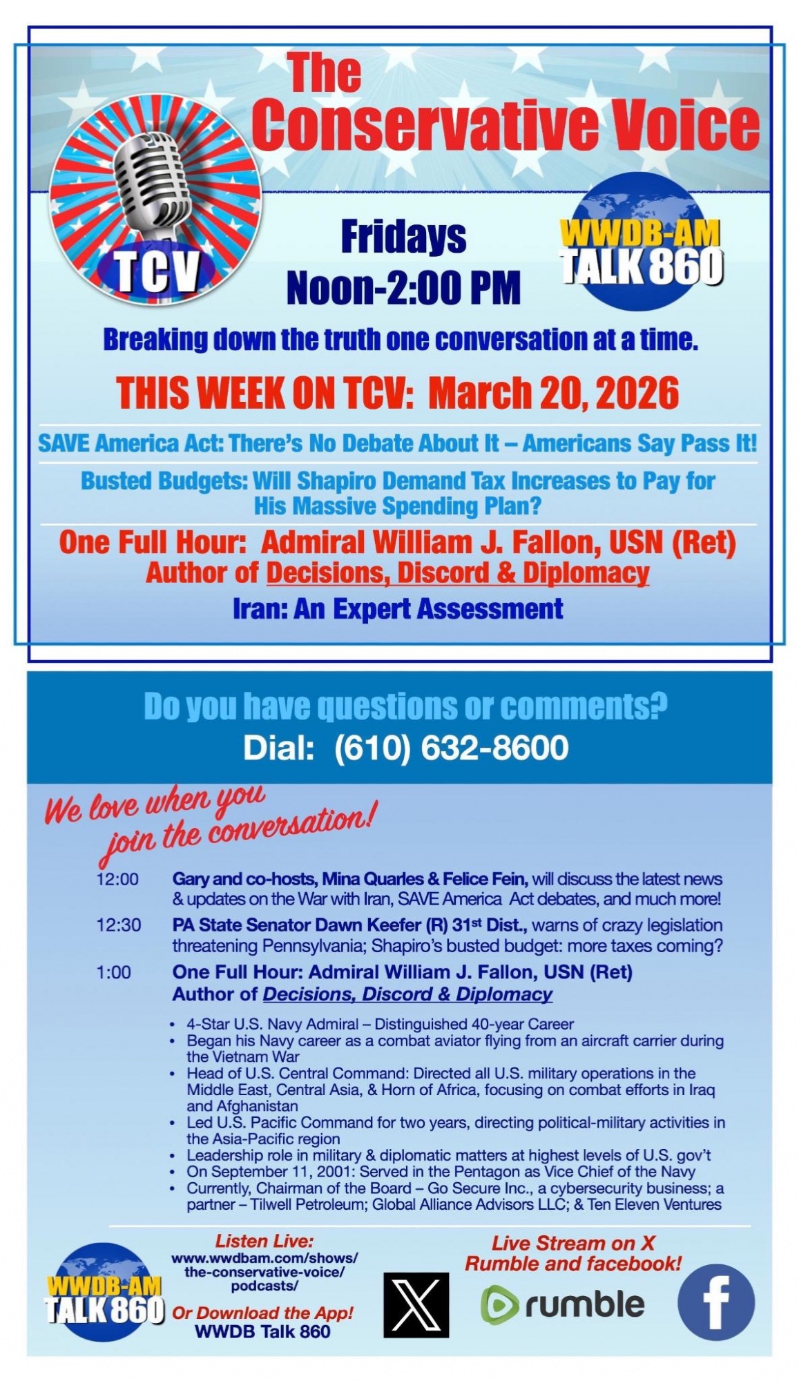 To listen live, click the WWDB link on the right, and look for the LISTEN LIVE button at the top. Click it to listen live! – Live streaming on X: https://x.com/TCVoiceWWDB – Rumble: https://rumble.com/c/c-6755485 – Facebook: https://www.facebook.com/profile.php?id=61565099367952 – YouTube: https://www.youtube.com/@TheConservativeVoicePhilly/streams