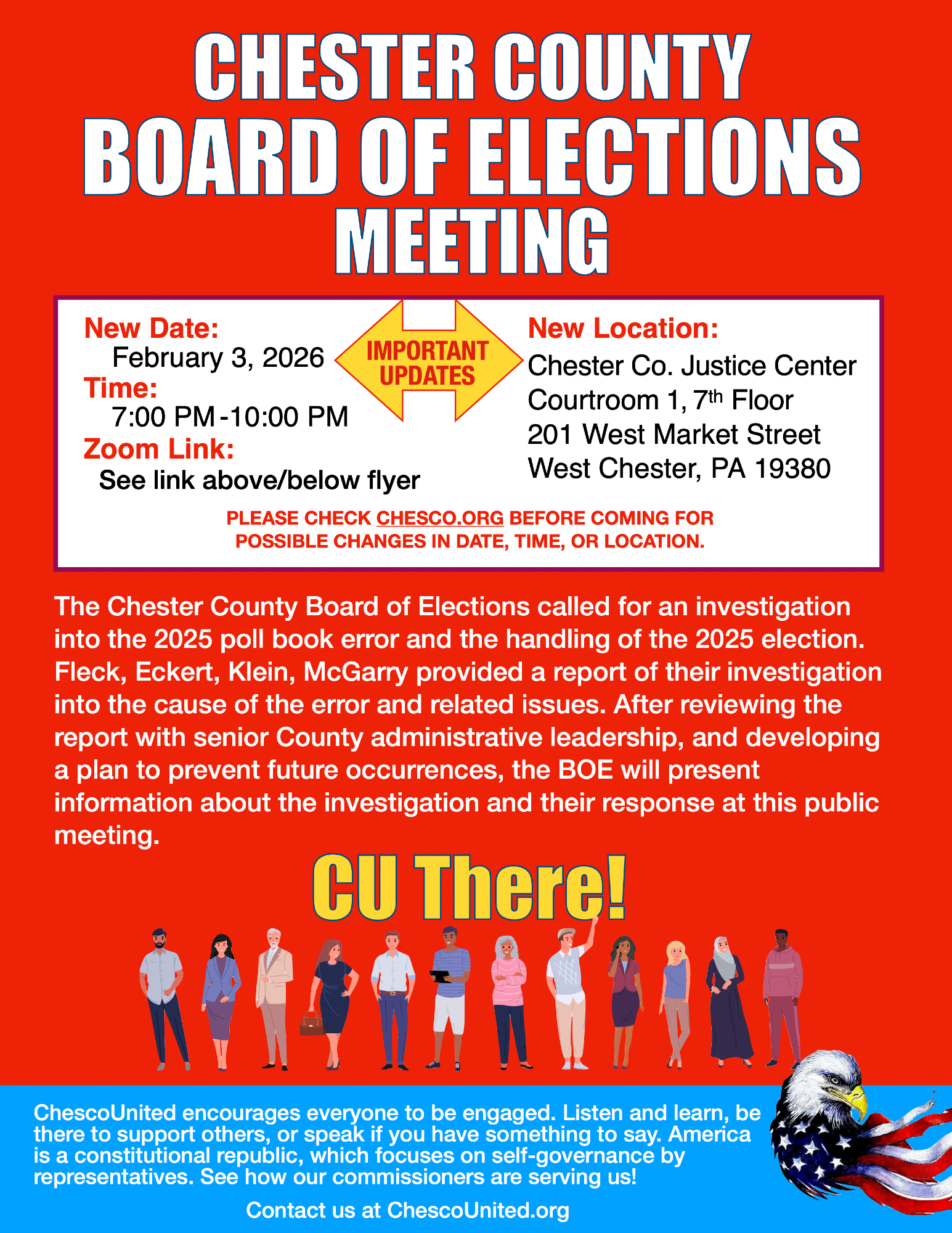 POSTPONED FROM JANUARY 27 TO FEBRUARY 3. Click the website link to the right to find more info and the ZOOM link. Residents are invited to participate via "Public Comment" in person or via Zoom: Click the "Join Meeting" link Webinar ID - 981 4489 4848 Passcode is 3132021 Call-in number: 267-831-0333 View Commissioners' Meeting agendas, minutes and videos at chesco.org/agendas